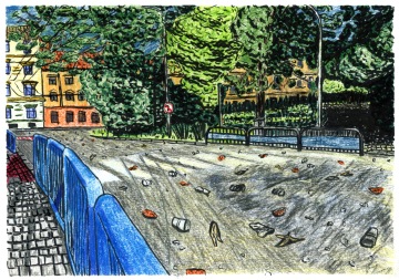„To je ale čurbes,“ prohlásí E. a zamračí se na zametací vůz. Trochu se zastydím. Vybavím si ten moment před dvěma a půl hodinami, kdy jsem dostala jeden kelímek do ruky, vypila obsah a čekala, abych se jedné z dobrovolnic zeptala, kam ho můžu vyhodit."