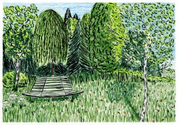 Listy, které prosvítily sluneční paprsky, jsou zespodu nápadně světlejší než ty ve stínu. Světle zelená, májová zeleň, chromová zeleň, borovicová zeleň. Z dálky koruna stromu působí jednolitě, jedna barva přechází v druhou. Zblízka se jednotlivé zelené puntíky formují do jasně ohraničených ostrých tvarů. Od kořene se javor rozdělil do pěti semknutých kmenů a pod ním se na mechu a trávě rýsují světlé ostrůvky slunečního světla, které se propletlo listím javorů, lip a kaštanů.