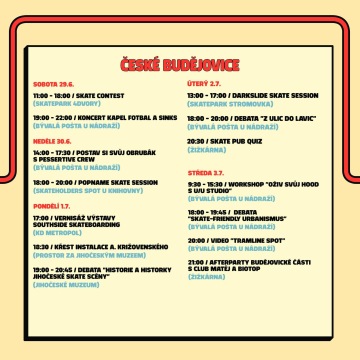 The whole program will start on Saturday 29 June, 2024 with a contest in the local skate park and will continue until Wednesday 3 July with daily activities, mainly discussions and workshops. On Thursday 4 July, the Skateholders Forum will move to Tabor to join the Transforma festival and culminate with the traditional DIY contest Vozová Hrotba.