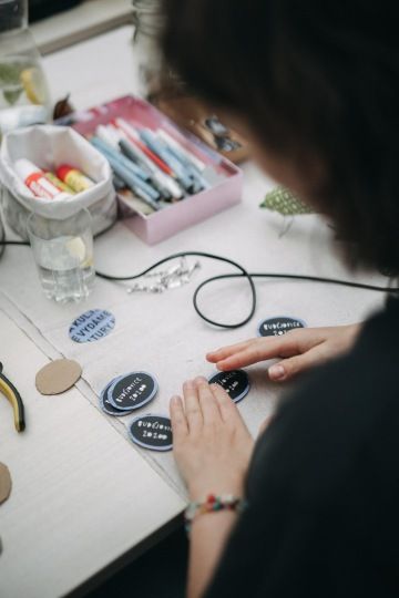 Kristina from Kabinet created a brooch for us that carries a clear message: 'I support the candidacy of Budějovice 2028'. When we were thinking how to be more visible in the public space without also flooding it with unsustainable material, working with Kabinet CB was a natural choice. But the cooperation with Kabinet has been going on for much longer. We use their great dishware rental service for our events, we've had an office at their place every Monday for a while, and... we're looking forward to seeing what we come up with next.