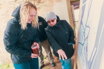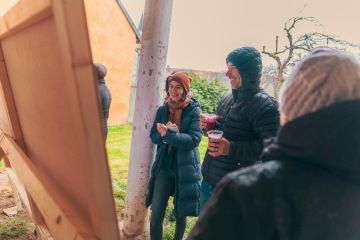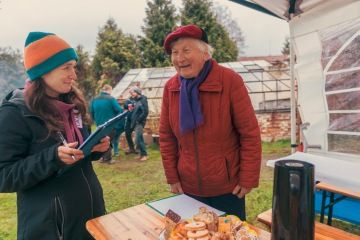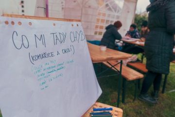 Na zahradě jsme zaparkovali malý karavan, se kterým objíždíme naše partnery a kde za standardních podmínek probíhá sociologický výzkum. Vzhledem k vytvrvalému dešti, jsme ale byli nuceni inprovizovat a sociologický výzkum prostřednictvím uskupení Socionaut, proběhl na zastřešeném místě. Socionaut od místních obyvatel zjišťoval potřeby, přání a představy, jak by vznikající spolkový dům měl vypadat, k čemu by měl sloužit.