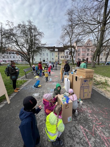 Zamýšlená malba by měla být interaktivní, vybízet ke hře a pozorování. Neurčovat pravidla, naopak vybízet k vytvoření hry vlastní. “Přeskoč! Jdi podle čáry! Kam ukazuje šipka? Kolik je puntíků na chodníku? Přeskáču jen po modrých? Je tady poklad?”